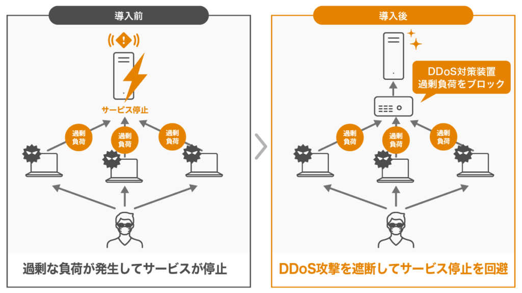 単一デバイスからのDoS攻撃のみならず、複数デバイスをボットネット化して同時攻撃を仕掛けるDDoS攻撃へ対応し、ビジネスの可用性を維持する技術です。トラフィックを常時監視して異常発生時は即座にフィルタリングを行い、ネットワーク帯域を埋め尽くす大規模攻撃からアプリ層(レイヤー7)への攻撃まで幅広く対応し、サービスの安定稼働を担保します。