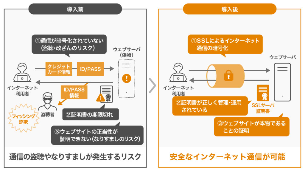 通信の暗号化に加え、認証局(CA)による「実在証明」でWebサイトの信頼性を担保する基盤技術です。盗聴や改ざんを防ぐだけでなく、フィッシング詐欺サイトとの判別を容易にし、ユーザーに「正規のサイトである」という安心感を提供する、セキュリティの基本要件です。また、証明書は短い期間でローテーションしていく必要があり、その作業の自動化構築も急務です。