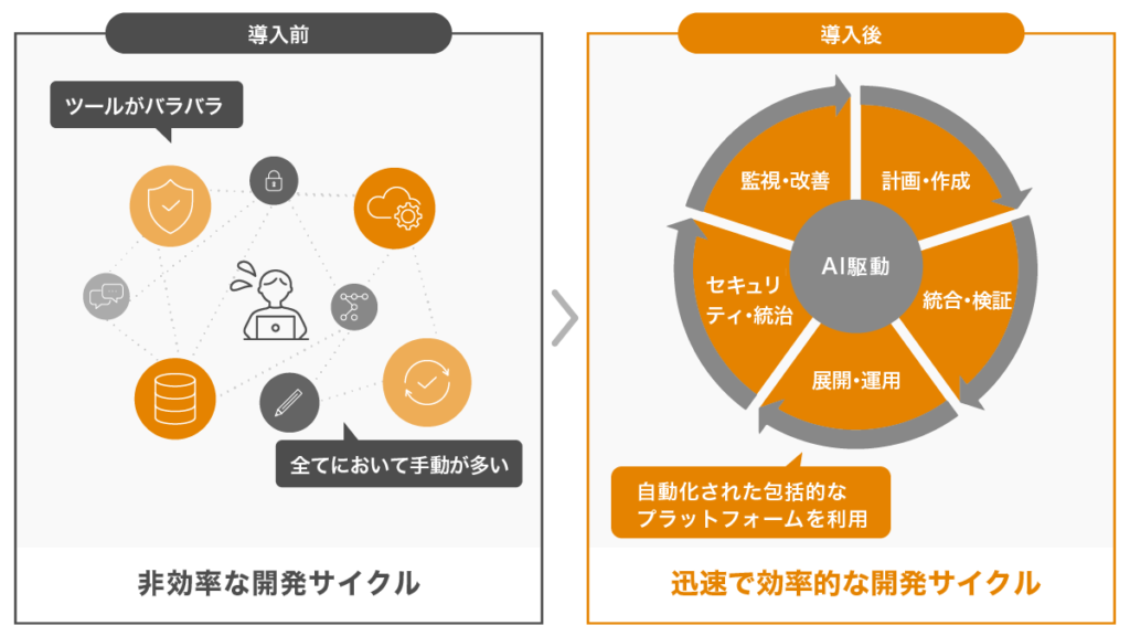 開発(Dev)と運用(Ops)にセキュリティ(Sec)を統合し、安全確保を自動化するアプローチです。コーディングやビルドの段階(CI/CDパイプライン)で脆弱性診断を自動で行うことで、リリース直前の手戻りを防ぎ、開発スピードを損なうことなくセキュアなアプリケーションを継続的に提供します。