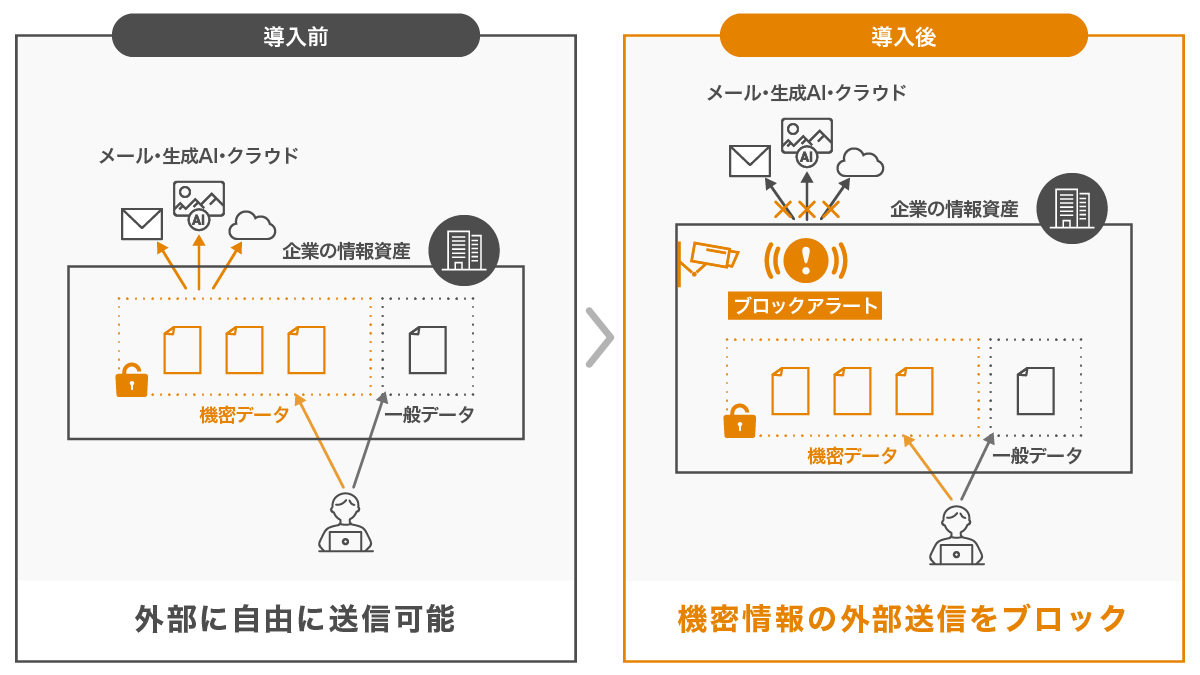 データ損失防止(DLP:Data Loss Prevention)ソリューションは、エンドポイント、ネットワーク、ストレージなど各種システムにおけるデータ利用および転送をリアルタイムでモニタリングします。定められたポリシーに基づき、内部からの不正な情報流出や誤った取り扱いを未然に防止し、企業内のデータ漏洩リスクを大幅に低減します。