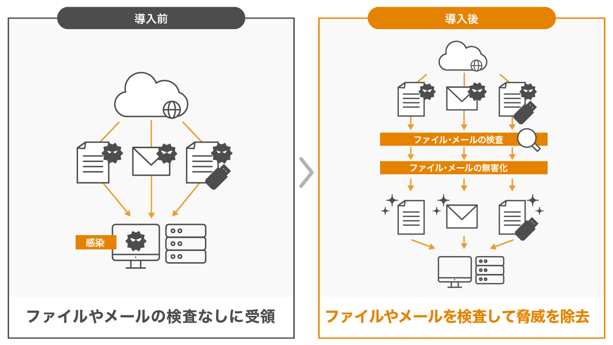 ファイル無害化技術は、受信ファイルや外部ソースから取得したデータに潜在するマルウェアや悪意あるコードを検出・除去します。これにより、従来のウイルス対策では検出が難しい脅威も安全な状態に再構成し、業務で利用されるデータのリスクを最小限に抑えます。