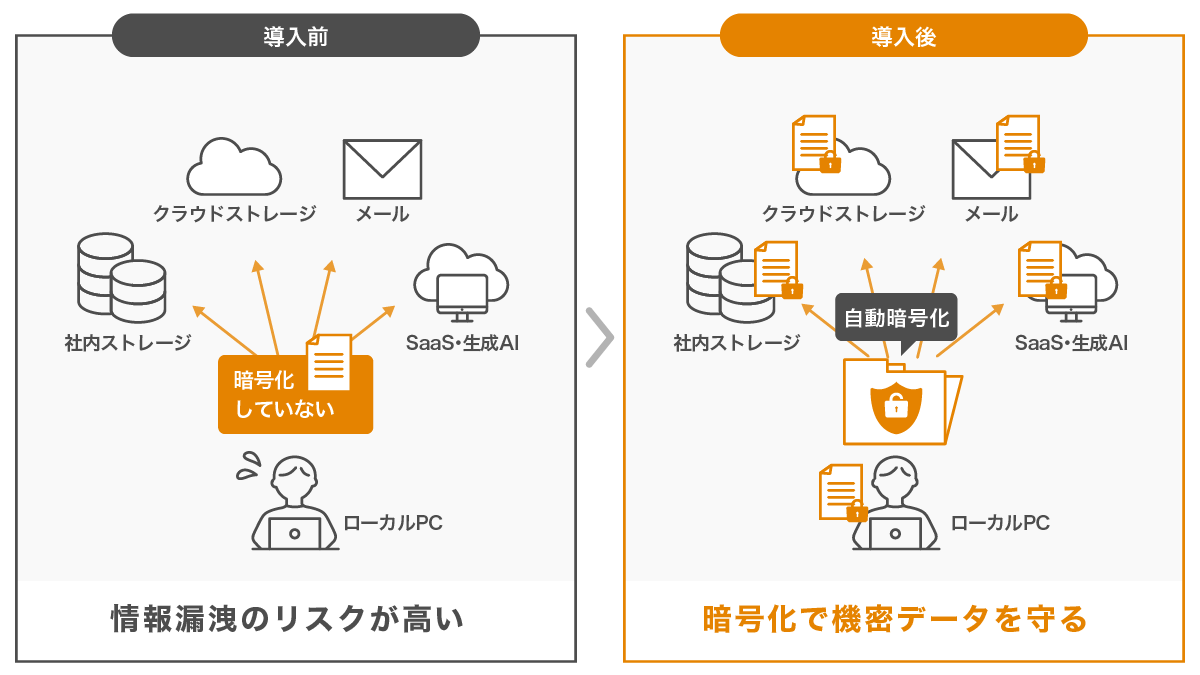 ファイル暗号化は、データ自体を高度な暗号アルゴリズムで保護し、不正アクセスや情報漏洩が発生した場合でも第三者による解読を事実上不可能にします。これにより、データの機密性および整合性を確保し、セキュリティインシデント時の被害拡大を防ぎます。