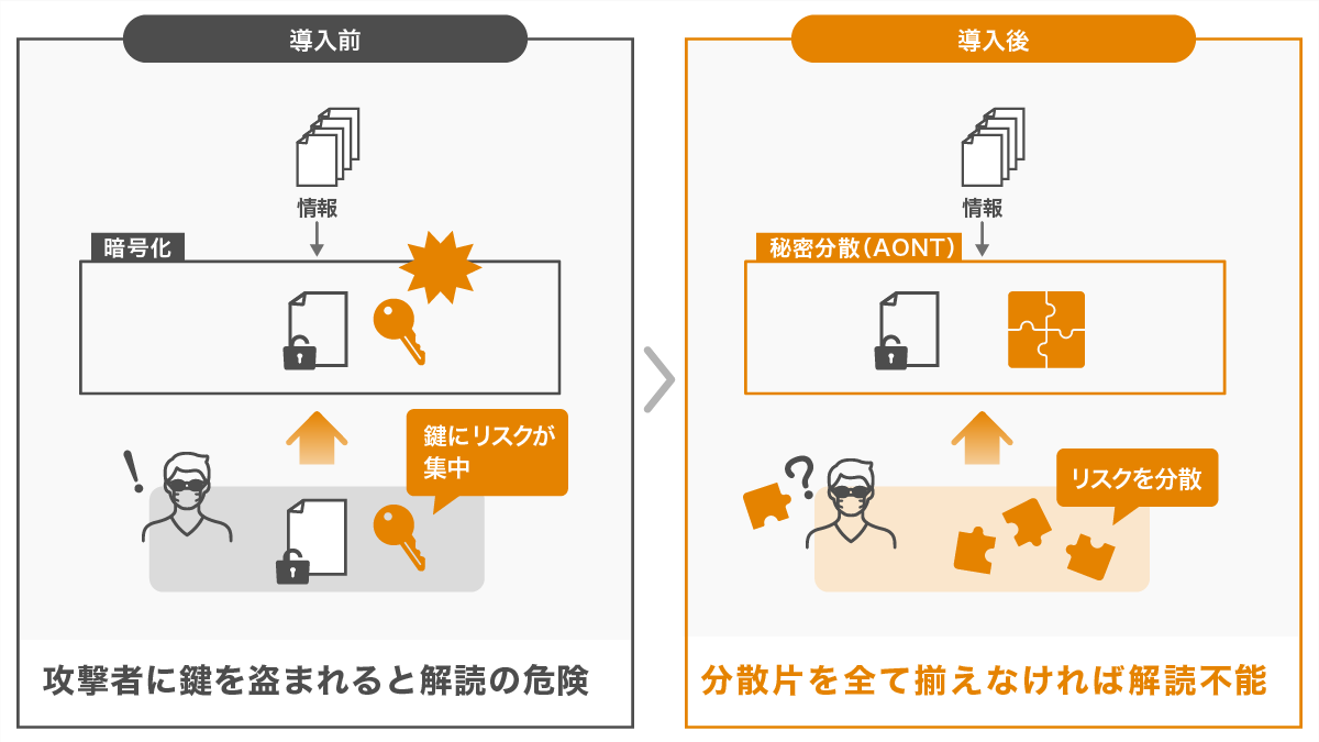 秘密分散技術は、重要なデータを複数の断片に分割し、それぞれを異なる保管場所に分散する手法です。各断片は単独では意味を持たず、万一一部が侵害された場合でも全体の情報漏洩を防止できるため、特に高いセキュリティレベルが要求されるデータ保護に有効です。