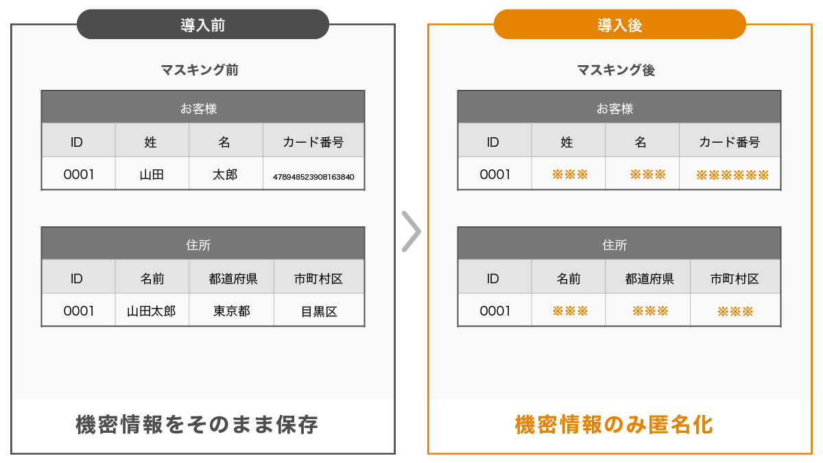データマスキングは、機密データの一部をランダムな値やプレースホルダーに置換することで、実際のデータ内容を秘匿しながら業務上必要な情報利用を可能にします。漏洩時のリスクを極力低減するため、特に個人情報や機密情報の取り扱いに有効です。