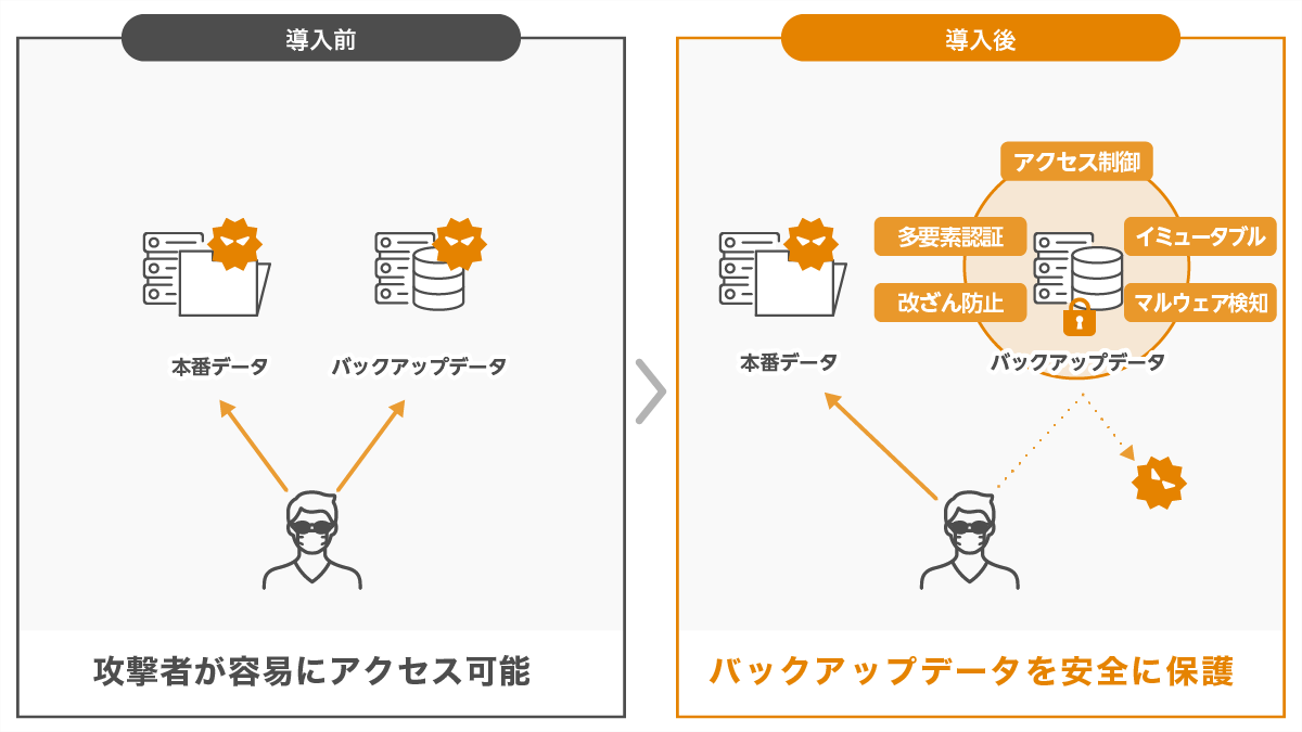 バックアップソリューションは、定期的なデータコピーと、バックアップデータの整合性チェック・不審な変更の検知機能を統合しています。これにより、システム障害やサイバー攻撃発生時にも迅速なデータ復旧が可能となり、業務継続性を確実にサポートします。