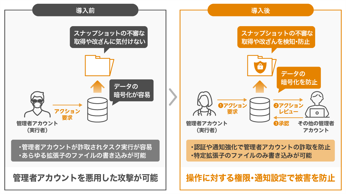 ストレージセキュリティは、保存されたデータに対して、スナップショットのロック機能、異常検知機能、および厳格なアクセス制御を実装することで、サイバー攻撃や不正アクセスからの保護を実現します。これにより、長期にわたる情報資産の安全性が維持され、迅速なリカバリが可能となります。